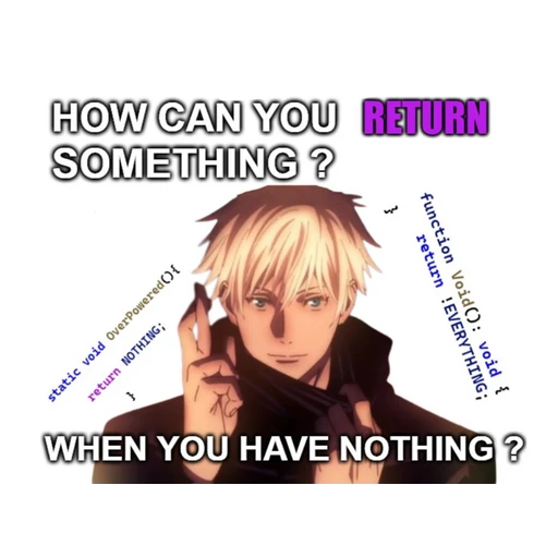 HOW CAN YOU RETURN SOMETHING? static void OverPowered() { return NOTHING; return ! EVERYTHING; function Void(): void { WHEN YOU HAVE NOTHING?