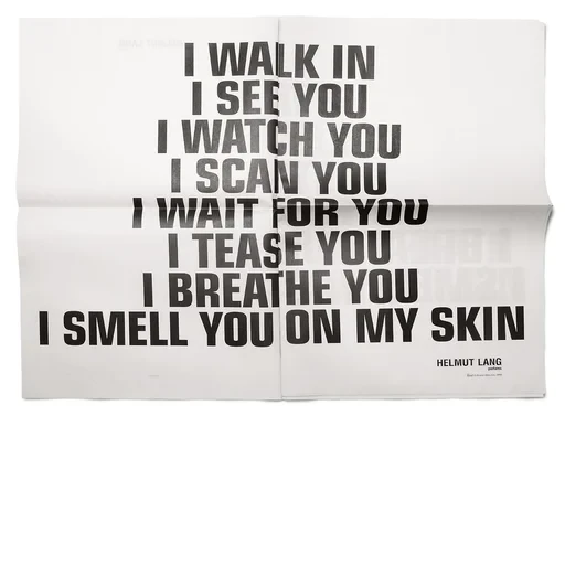 I WALK IN I SEE YOU I WATCH YOU I SCAN YOU I WAIT FOR YOU I TEASE YOU I BREATHE YOU I SMELL YOU ON MY SKIN HELMUT LANG