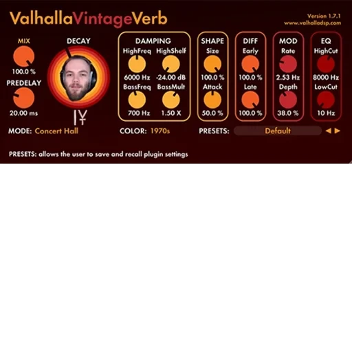 Valhalla VintageVerb MIX Version 1.7.1 www.valhalladsp.com DECAY DAMPING HighFreq HighShelf SHAPE DIFF MOD EQ Size Early Rate HighCut 100.0 % PREDELAY 6000 Hz -24.00 dB BassFreq BassMult 100.0 % 100.0% Attack 2.53 Hz Late Depth 8000 Hz LowCut 20.00 ms I 700 Hz 1.50 X 50.0% 100.0% 38.0% 10 Hz MODE: Concert Hall COLOR: 1970s PRESETS: Default PRESETS: allows the user to save and recall plugin settings