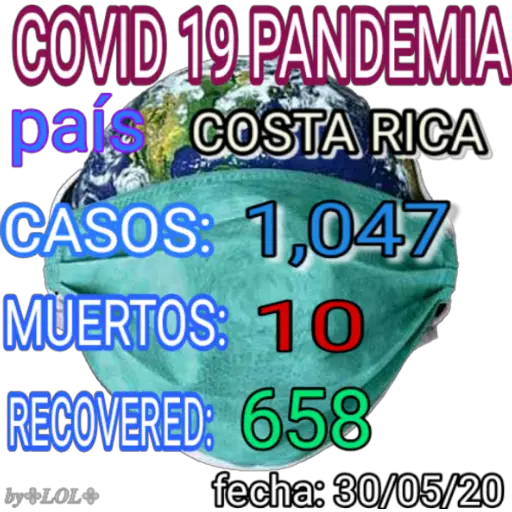 COVID 19 PANDEMIA paí COSTA RICA CASOS: 1,047 MUERTOS: 10 RECOVERED: 658 by+LOLA feche: 30/05/20