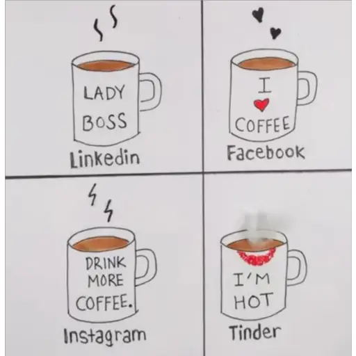 ss LADY BOSS Linkedin nh DRINK MORE COFFEE. Instagram I COFFEE Facebook I'M HOT Tinder