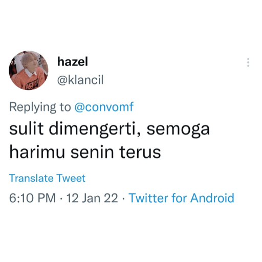 hazel @klancil Replying to @convomf sulit dimengerti, semoga harimu senin terus Translate Tweet 6:10 PM 12 Jan 22 Twitter for Android :