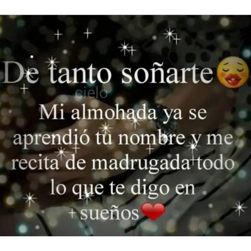 + De tanto soñarte + cielo Mi almohada ya se aprendió tu nombre y me recita de madrugada todo lo que te digo en + sueños