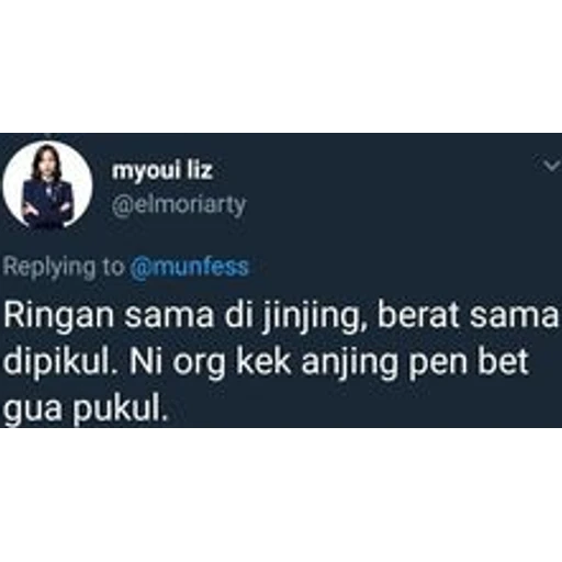 O Replying to @munfess Ringan sama di jinjing, berat sama dipikul. Ni org kek anjing pen bet gua pukul. myoui liz @elmoriarty