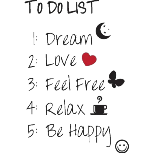 TO DO LIST 1: Dream 2: Love 3: Feel Free C 4: Relax 5: Be Happy