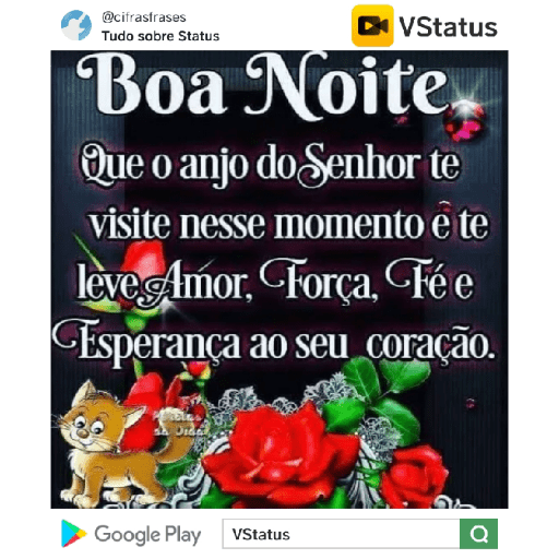 @cifrasfrases Tudo sobre Status ► VStatus Boa Noite Que o anjo do Senhor te visite nesse momento è te leve Amor, Força, Fé e Esperança ao seu coração. Google Play VStatus
