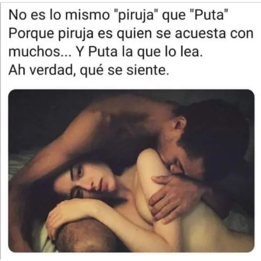No es lo mismo "piruja" que "Puta" Porque piruja es quien se acuesta con muchos... Y Puta la que lo lea. Ah verdad, qué se siente.